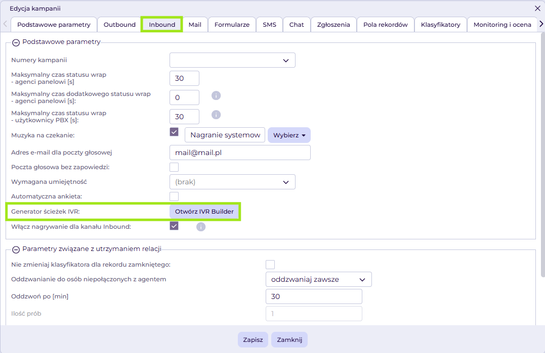 Rys.1 - Okno edycji Kampanii, zakładka Inbound z zaznaczona opcją "Otwórz IVR Builder"