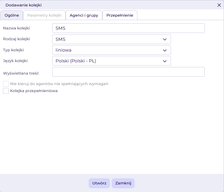 Przychodzące SMS-y są przekazywane agentom do obsługi zgodnie z wybranym rodzajem kolejkowania. Aby utworzyć kolejkę postępuj zgodnie z poniższymi krokami: