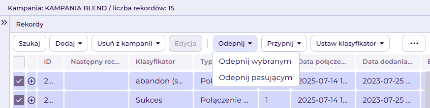 - Odepnij pasującym - usunięcie prywatności rekordom spełniającym kryteria filtra