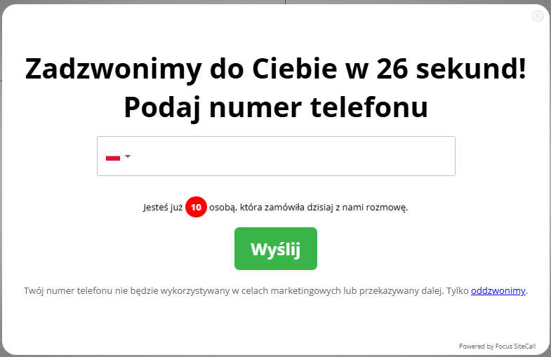 Kliknięcie w ikonę powoduje otwarcie formularza, w którym użytkownik wpisuje swój numer telefonu i inicjuje połączenie.