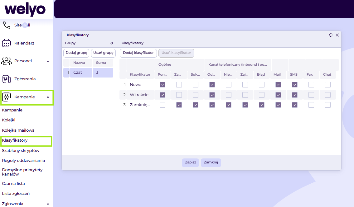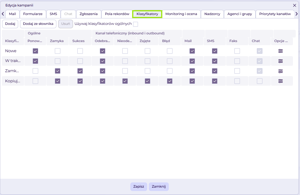 Oznaczeniu etapu rozmowy z klientem, dzięki wykorzystaniu klasyfikatorów. Do wyboru mamy dwie możliwości konfiguracji. Pierwsza - biblioteka klasyfikatorów - pozwala na utworzenie grup predefiniowanych klasyfikatorów. Druga to konfiguracja klasyfikatorów bezpośrednio w kampanii.
