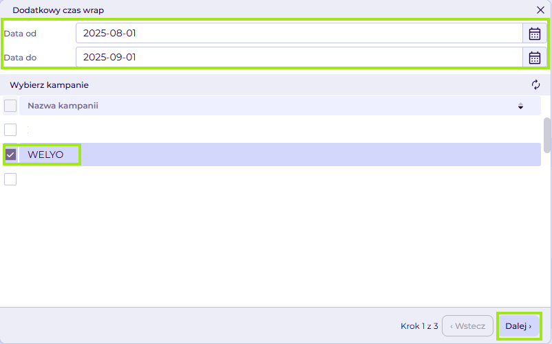 Aby przejść dalej, wybieramy datę oraz co najmniej jedną kampanię.