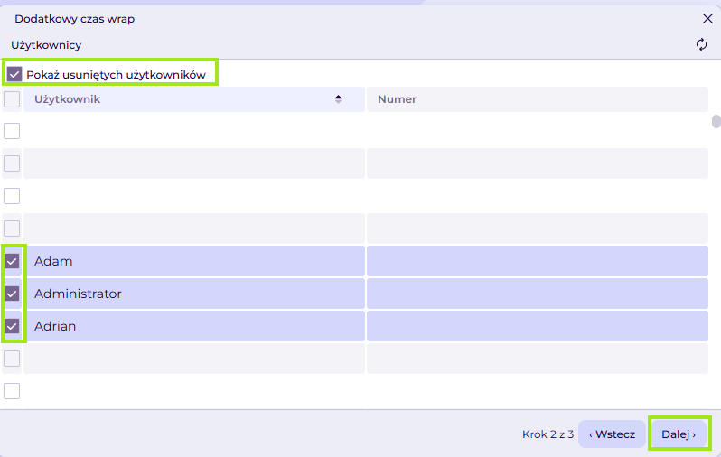 - możemy zaznaczyć opcję Pokaż usuniętych użytkowników, aby na liście do wyboru wyświetlili się także usunięci agenci