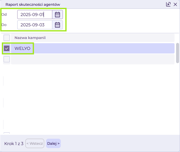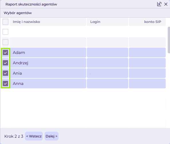 - wybieramy agentów, dla których chcemy wygenerować raport,