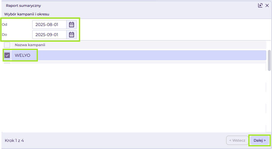 Wybieramy kampanie oraz zakres dat i klikamy Dalej.