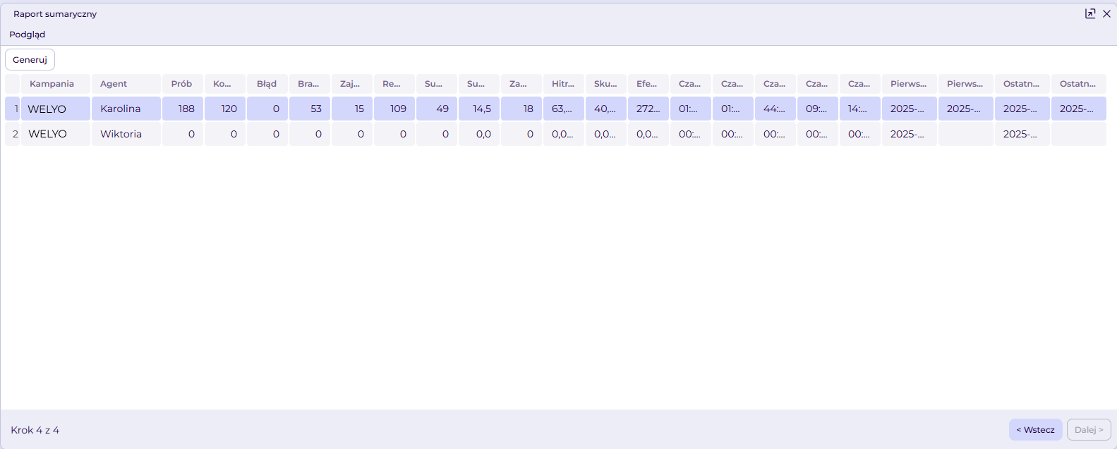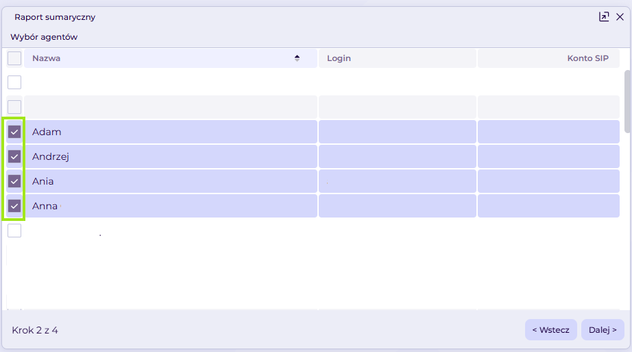 Wybieramy agentów, dla których chcemy wygenerować raport i klikamy Dalej.