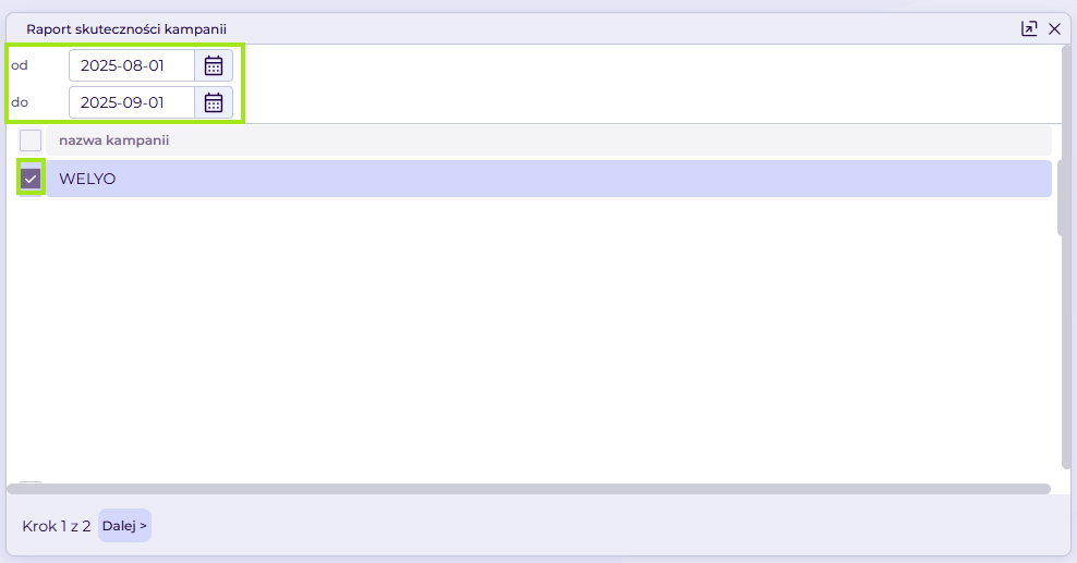 - Kampanie – wybór jednej lub wielu kampanii.