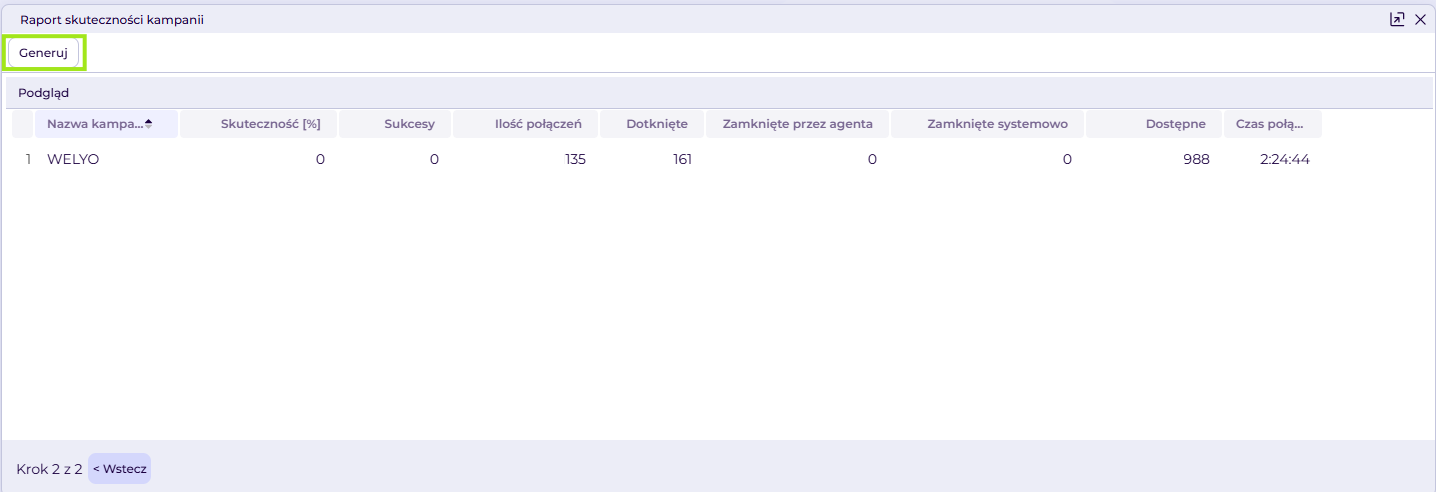 Raport skuteczności kampanii przedstawia informacje o wykorzystaniu klasyfikatorów oznaczonych jako sukces w wybranych kampaniach. Pozwala analizować skuteczność pracy agentów oraz efektywność zamykania rekordów. Dane mogą zostać pobrane w formacie XLSX.