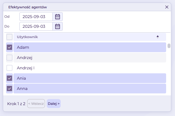 Lista agentów obejmuje wyłącznie aktywnych użytkowników.