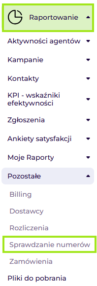 Przejdź do menu Raportowanie > Pozostałe > Sprawdzanie numerów