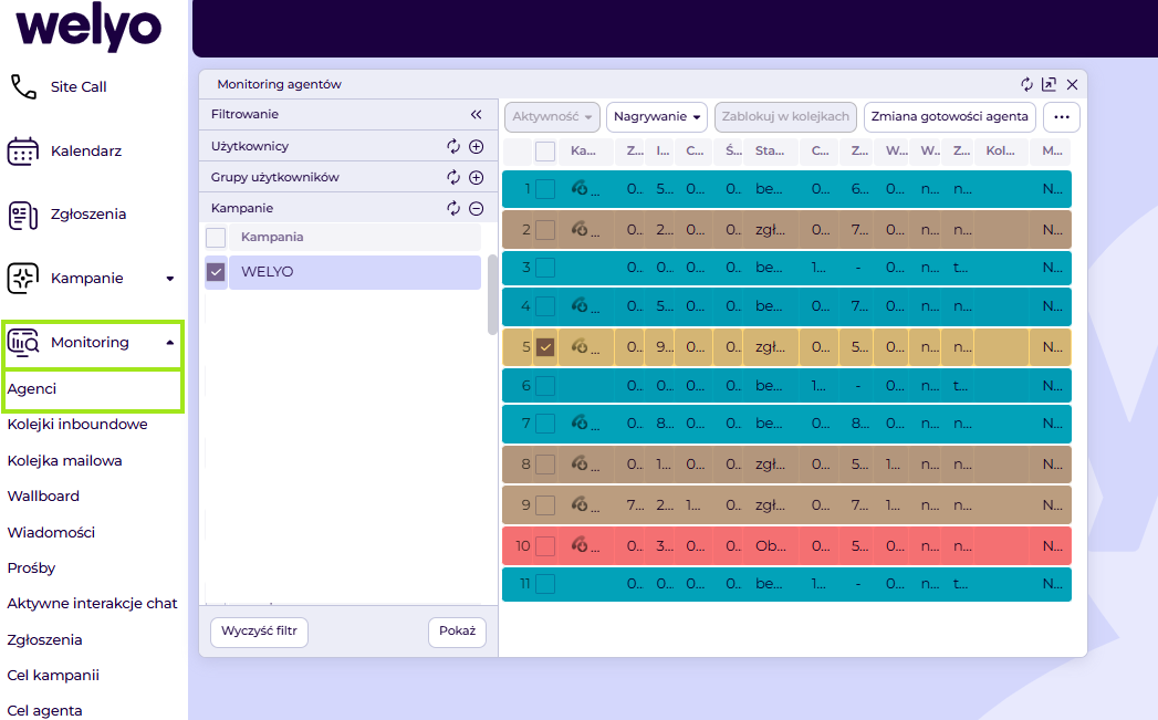 Monitoring agentów umożliwia bieżące śledzenie aktywności użytkowników pracujących w kampaniach. Funkcja ta pozwala na podgląd statusów aktualnych agentów, ich dostępności oraz aktualnie realizowanych połączeń, co wspiera nadzór nad pracą zespołu i szybkie reagowanie na bieżące sytuacje.