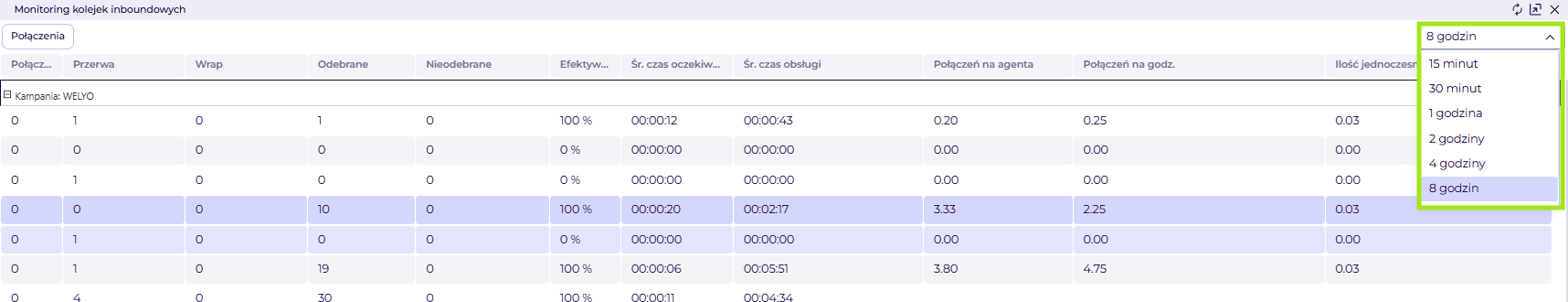 - Połączeń na agenta – ilość połączeń w ustawionym przedziale czasu podzielona przez liczbę agentów w kolejce