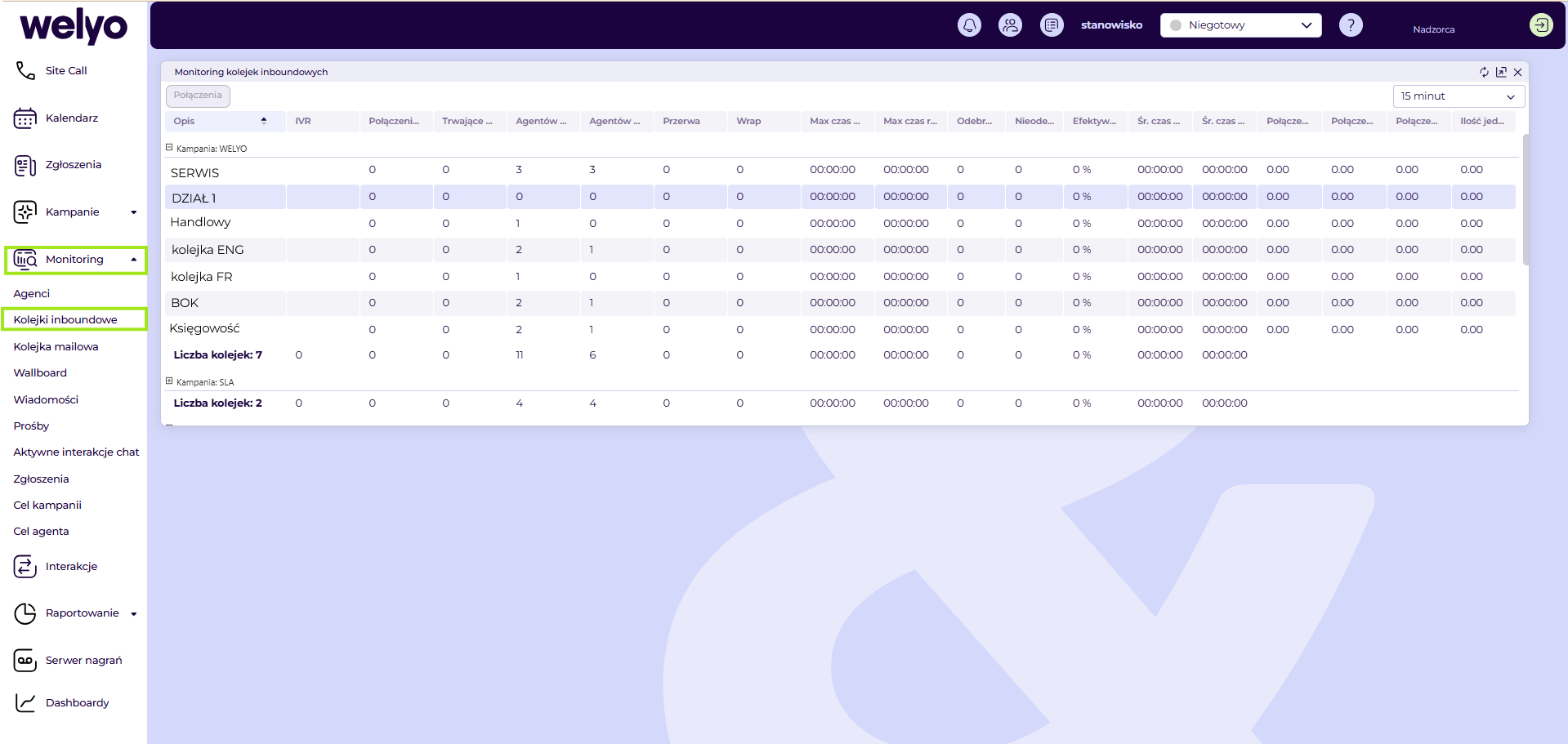 Monitoring kolejek inboundowych umożliwia bieżące śledzenie ruchu przychodzącego oraz obciążenia agentów w poszczególnych kolejkach. Dane prezentowane są w formie tabeli, w której możemy samodzielnie wybrać widoczne kolumny.