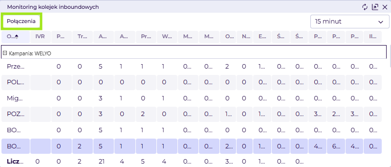 - IVR – ilość połączeń będących jeszcze przed kolejką (np. na zapowiedziach, dokonując wyboru na bloczkach menu)