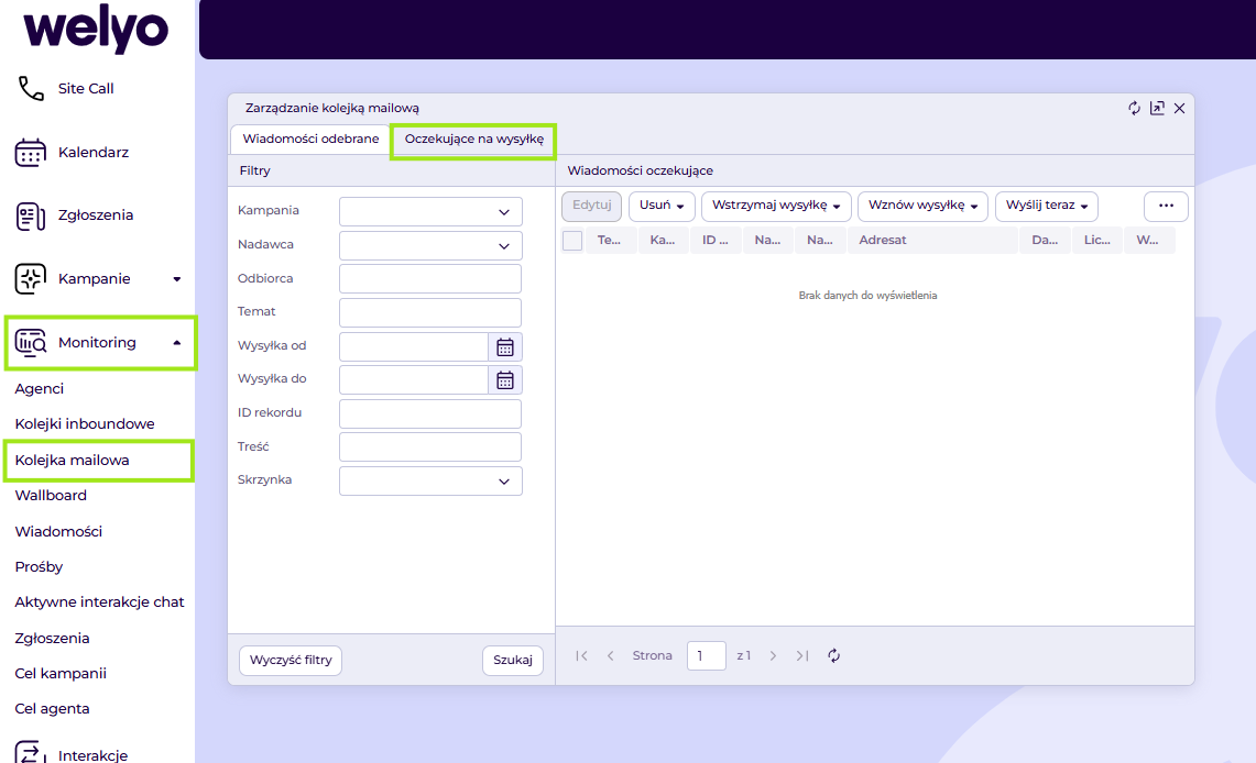 Monitoring kolejek mailowych składa się z dwóch zakładek: Wiadomości odebrane i Wiadomości oczekujące na wysyłkę.