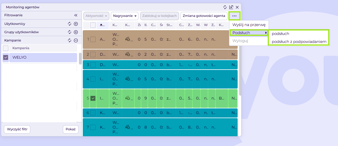 Funkcja podsłuchu umożliwia bieżące monitorowanie rozmów prowadzonych przez agentów. Jest szczególnie przydatna w procesie szkolenia, kontroli jakości oraz wsparcia agentów w trakcie kontaktu z klientem. Aby z niej skorzystać, konieczne jest wcześniejsze skonfigurowanie stanowiska, na które zostanie zestawione połączenie.