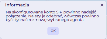 Po wybraniu odpowiedniej opcji w panelu pojawi się komunikat informujący o zestawieniu połączenia na skonfigurowane konto SIP.