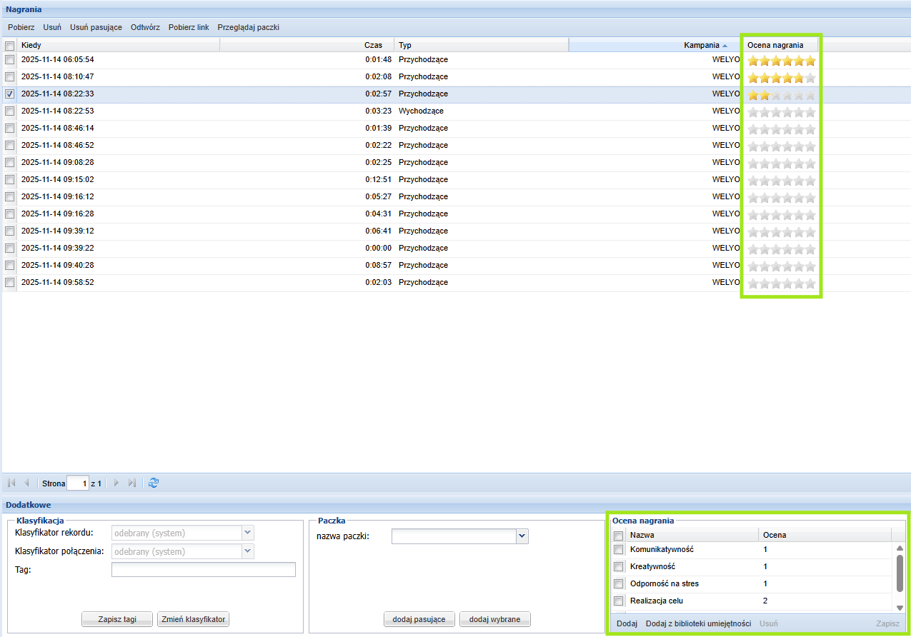 Celem funkcji oceny nagrań jest umożliwienie administratorom / nadzorcom merytorycznej weryfikacji jakości rozmów prowadzonych przez agentów.