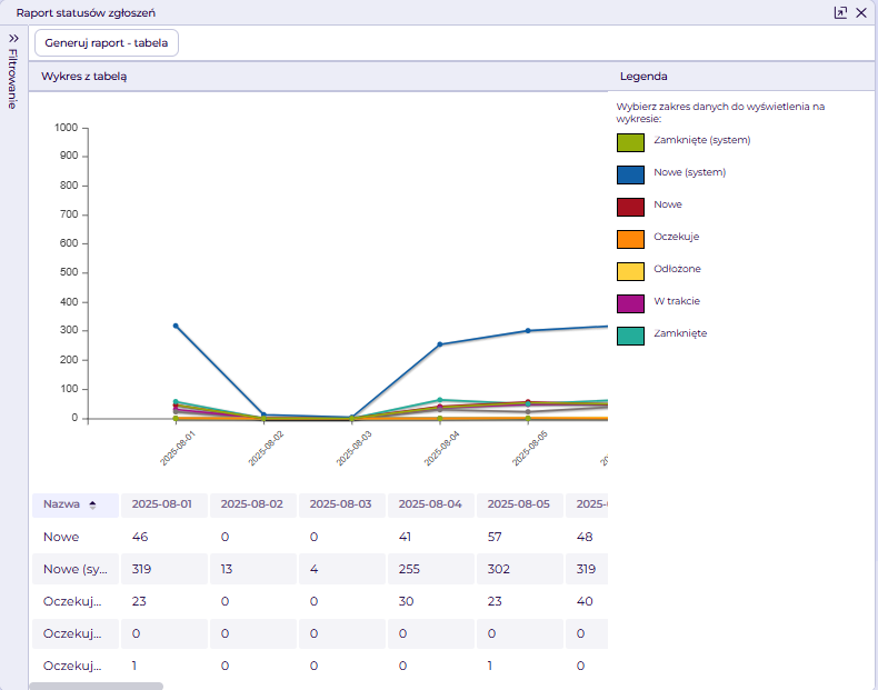 Raport statusów zgłoszeń umożliwia analizę liczby zgłoszeń według ich statusów w wybranym przedziale czasu. Dane prezentowane są w formie wykresu oraz tabeli.