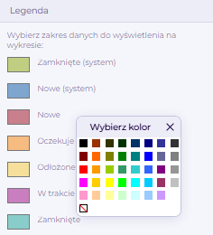Wykres liniowy pokazuje liczbę zgłoszeń dla wybranych statusów w czasie. Można włączać lub wyłączać poszczególne statusy oraz zmieniać ich kolory.