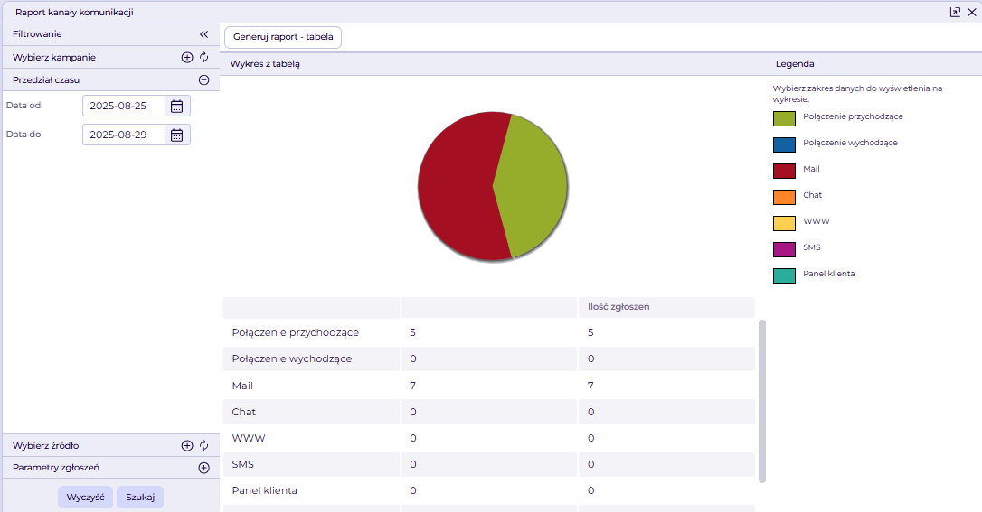 Raport kanałów komunikacji umożliwia analizę liczby zgłoszeń według kanałów komunikacji w wybranym przedziale czasu. Dane prezentowane są w formie wykresu oraz tabeli.