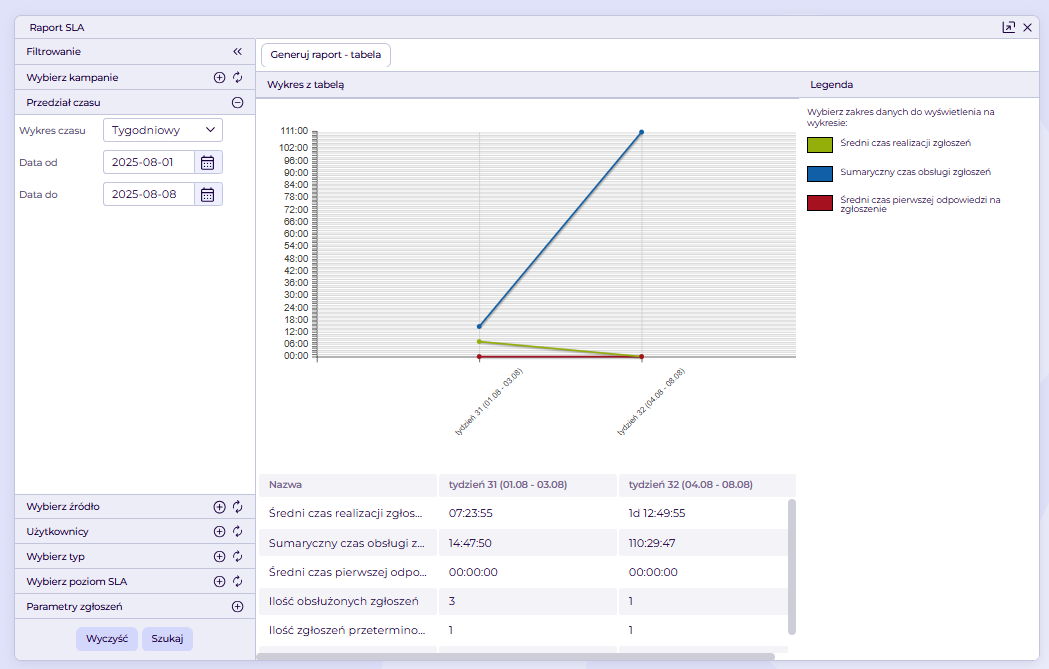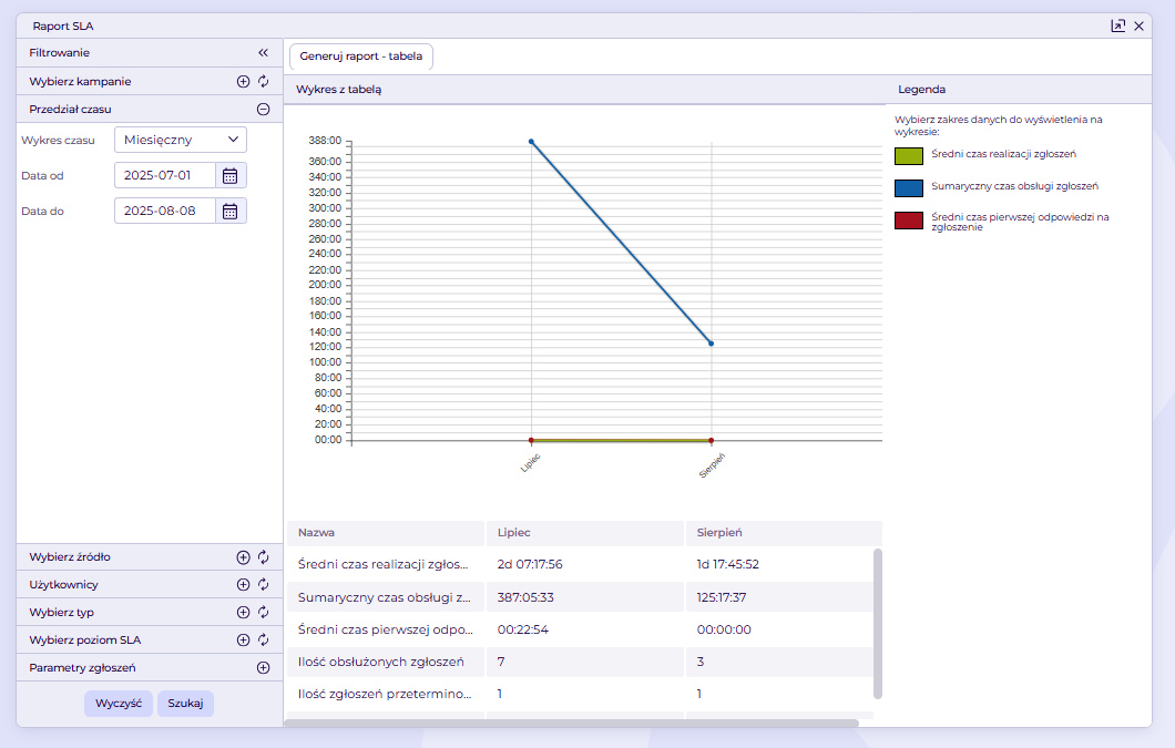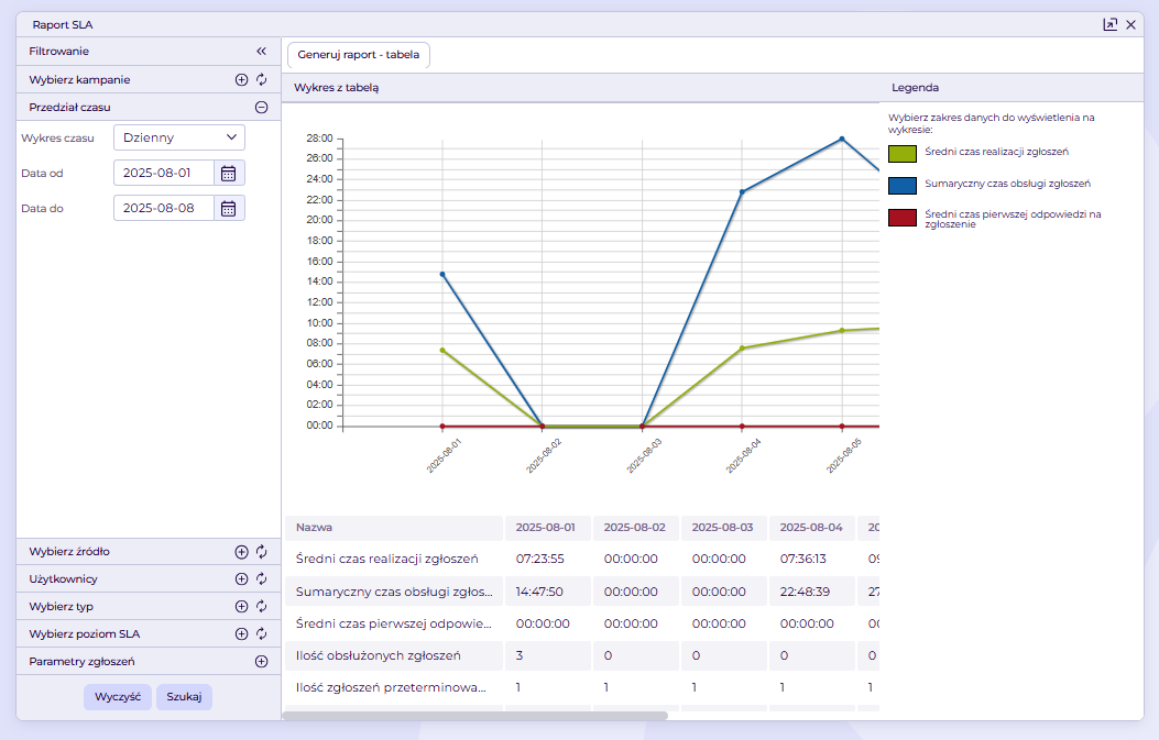 Raportowanie > Zgłoszenia >SLA zgłoszeń