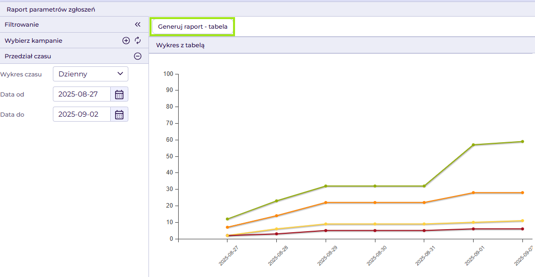 Aby wygenerować raport, należy wybrać parametr, ustawić filtry (np. zakres dat, kampanie), a następnie uruchomić wyszukiwanie. Wyniki zostaną przedstawione na wykresie i w tabeli.