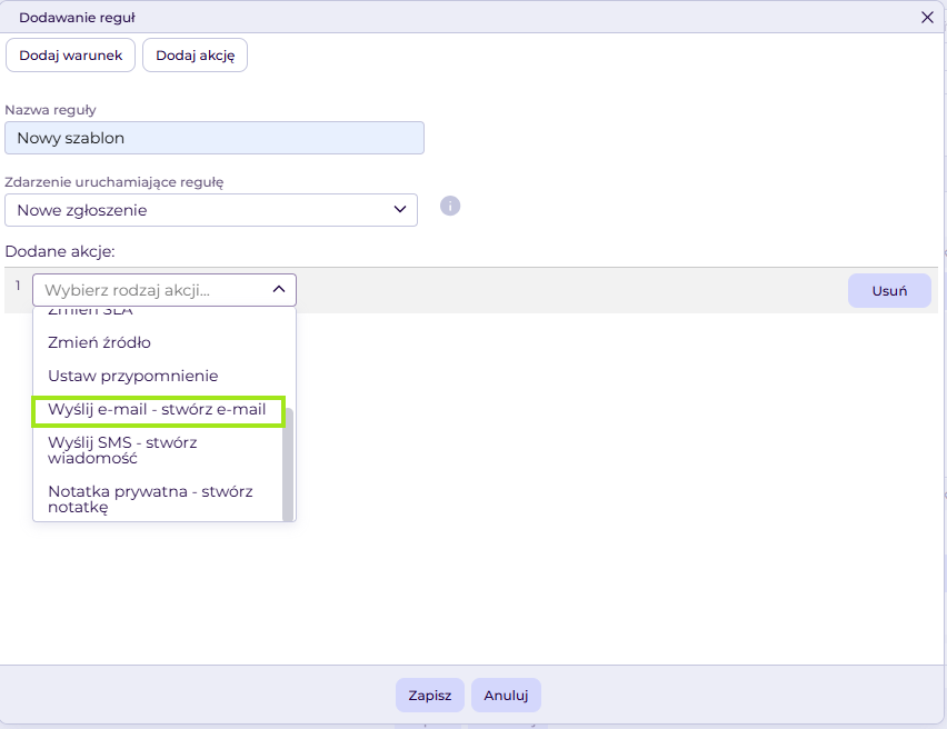 Zdefiniuj warunki dla reguły, jakie mają wystąpić na zgłoszeniu a następnie w akcjach z pola rozwijanego wybierz Wyślij e-mail – stwórz e-mail.