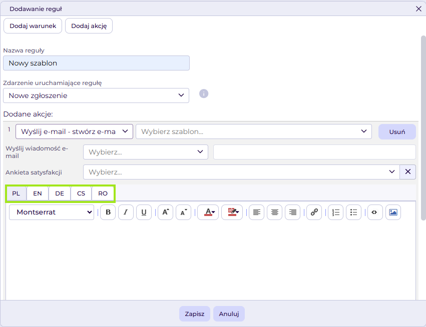 Następnie analogicznie jak w przypadku makr, w edytorze tekstu dostępne są zakładki z poszczególnymi językami. Wybierz szablon wiadomości e-mail lub wpisz własny tekst w edytorze w każdej z zakładek językowych.