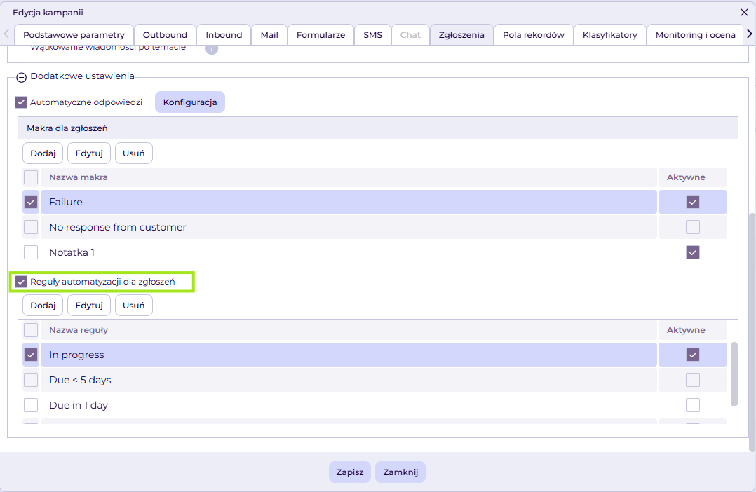 W wyświetlonym oknie przejdź do zakładki Zgłoszenia. W obszarze Dodatkowe ustawienia zaznacz checkbox Makra dla zgłoszeń. Dodaj nowe makro lub edytuj istniejące.