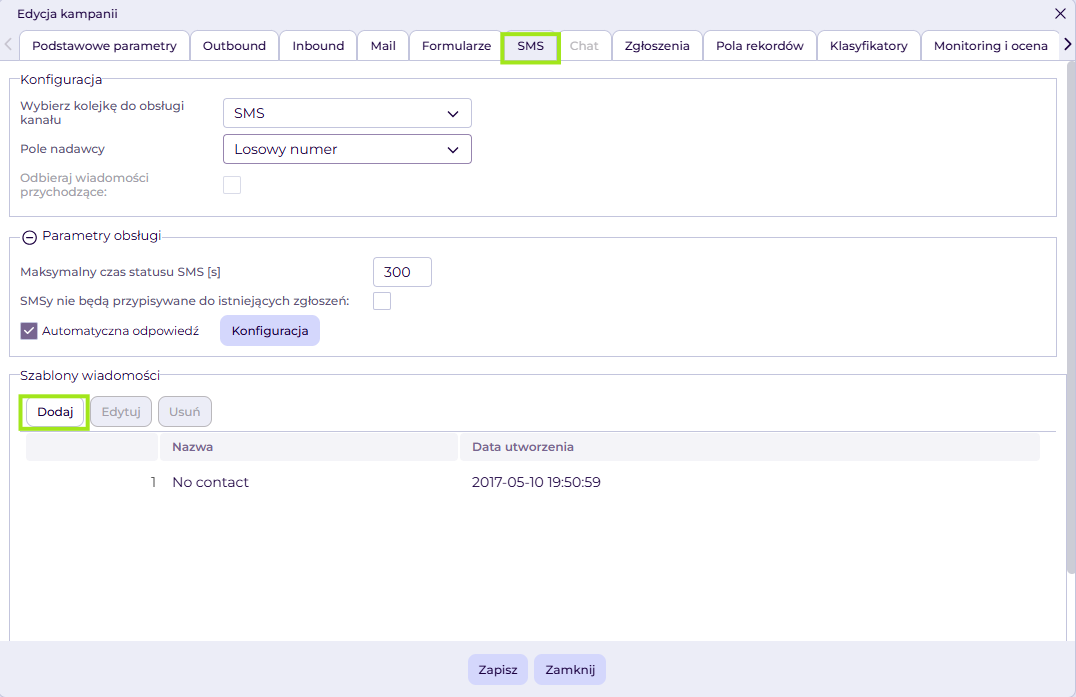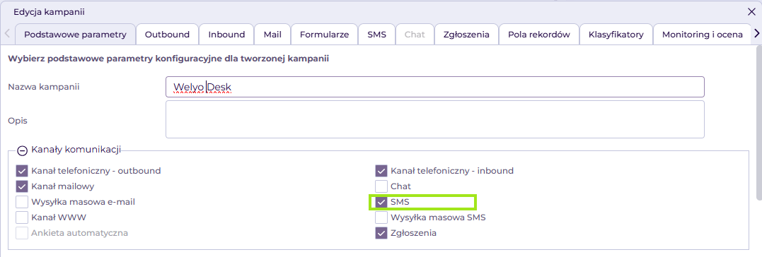 Konfiguracja kanału SMS w kampanii zgłoszeniowej