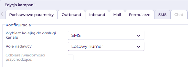 W następnym kroku przejdź do zakładki SMS. Wybierz Kolejkę do obsługi kanału SMS oraz Pole nadawcy. W tym polu możesz wybrać wysyłkę wiadomości SMS z losowego numeru bądź, jeśli masz wykupioną usługę SMS PRO, możesz wybrać Dedykowany numer telefonu do wysyłki wiadomości. Dodatkowo możesz zaznaczyć Odbieraj wiadomości przychodzące, jeśli chcesz, aby kampania odbierała wiadomości SMS od klientów.
