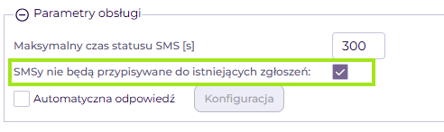 Dalsze parametry dotyczą obsługi zgłoszeń. Ustaw Maksymalny czas na obsługę wiadomości SMS. Jeśli chcesz, aby każda wiadomość przychodząca SMS tworzyła nowe zgłoszenie, zaznacz checkbox SMSy nie będą przypisywane do istniejących zgłoszeń.