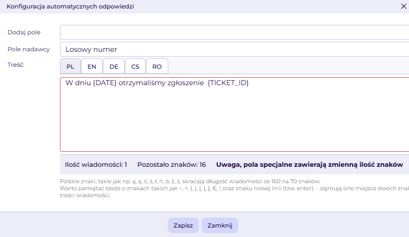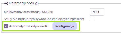 Następnym parametrem do zdefiniowania jest Automatyczna odpowiedź na wiadomość SMS. Jeśli chcesz, żeby system wysyłał automatyczną wiadomość do klienta np. o potwierdzeniu rejestracji zgłoszenia, zaznacz tę opcję i kliknij Konfiguracja.
