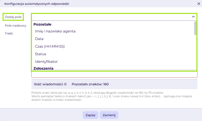 W wyświetlonym oknie wybierz Pole nadawcy i wpisz Treść automatycznej wiadomości. Możesz wykorzystać gotowe Pola systemowe oraz zdefiniowane w kampanii pola rekordu. Po ich wybraniu odkładane są one w treści wiadomości w miejscu kursora.