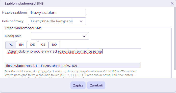 Ostatnim etapem konfiguracji kanału SMS są Szablony wiadomości, możliwe do wyboru dla agentów. W obszarze Szablony wiadomości kliknij Dodaj, aby zdefiniować nowy szablon. W wyświetlonym oknie wpisz Nazwę szablonu, i analogicznie jak w przypadku konfiguracji automatycznej odpowiedzi, wypełnij pozostałe pola.