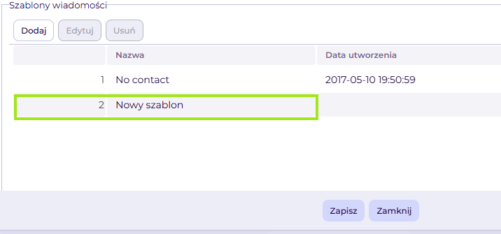 Po zapisaniu szablonu, będzie on widoczny na liście wszystkich zdefiniowanych szablonów w kampanii. Po zapisaniu ustawień kampanii, szablon będzie dostępny dla agenta w karcie klienta. Możesz Dodać nowy szablon, Edytować lub Usunąć istniejący.