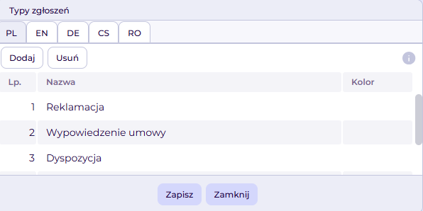 W pierwszej zakładce - polskiej zdefiniuj nowe typy zgłoszeń, edytuj lub usuń istniejące.
