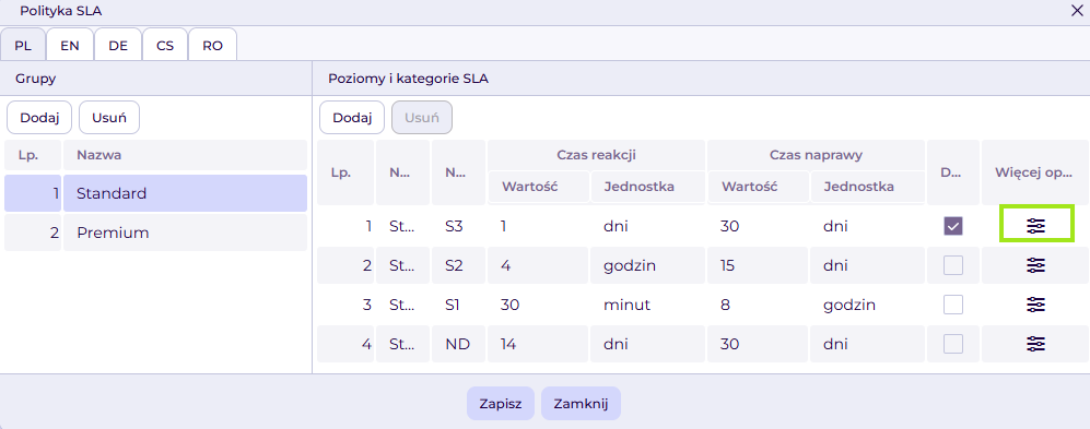 Aby zdefiniować automatyczne odpowiedzi poza godzinami pracy, przejdź do edycji polityki SLA. Zdefiniuj ustawienia polityki SLA w pierwszej zakładce, a w następnych dodaj tłumaczenia adekwatne do nazwy zakładki.
