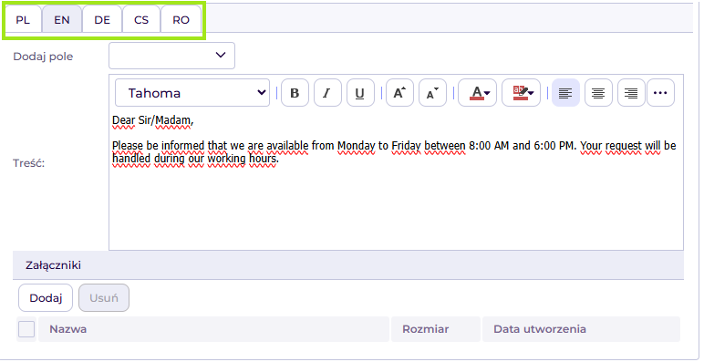 Po zdefiniowaniu wszystkich pól w pierwszej zakładce, przejdź do zakładki angielskiej (EN). Przetłumacz tekst wiadomości w języku polskim na język angielski.