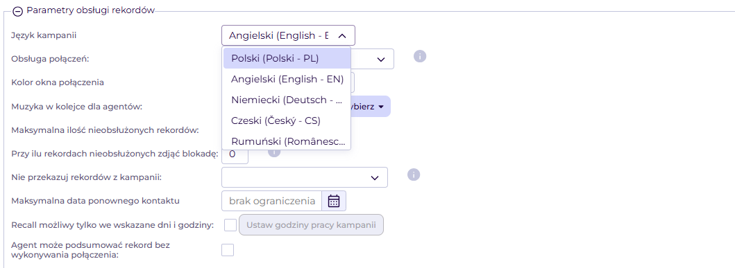 W zakładce Podstawowe parametry przejdź do obszaru Parametry obsługi rekordów i wybierz język kampanii. Możesz wybrać język polski, angielski, niemiecki, czeski lub rumuński.