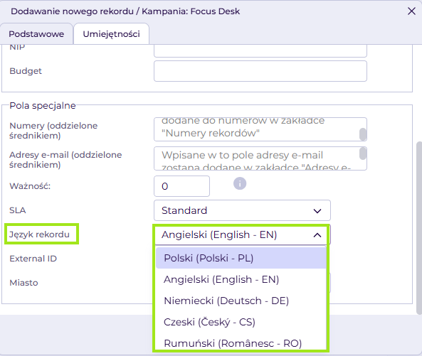 W przypadku edycji lub dodawania pojedynczego rekordu, w zakładce Podstawowe, przejdź do obszaru Pola specjalne i wybierz język rekordu. Możesz wybrać język polski, angielski, niemiecki, czeski lub rumuński.