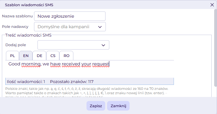 Analogicznie wypełnij zakładki z pozostałymi językami. Jeśli Twoja firma nie obsługuje klientów w którymś z języków, nie musisz jej wypełniać. System będzie wysyłał wiadomości SMS w języku zgodnym z językiem rekordu, a jeśli nie będzie zdefiniowany - z językiem kampanii.