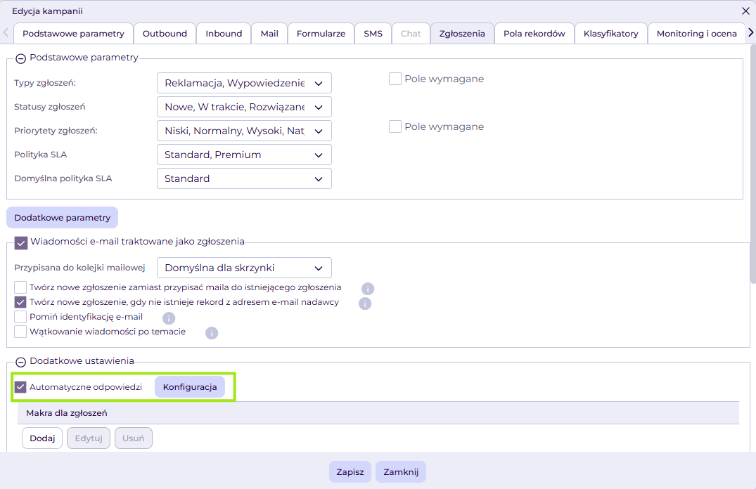 Aby skonfigurować automatyczne odpowiedzi w trakcie godzin pracy, w edycji kampanii przejdź do zakładki Zgłoszenia. W obszarze Dodatkowe ustawienia zaznacz checkbox Automatyczne odpowiedzi i kliknij Konfiguracja.