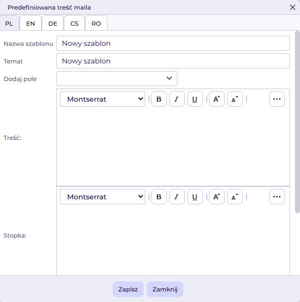 W pierwszej zakładce zredaguj nazwę szablonu i temat. Uzupełnij treść wiadomości. Możesz dodać stopkę oraz załączniki.