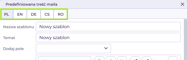 Analogicznie wypełnij zakładki z pozostałymi językami. Jeśli Twoja firma nie obsługuje klientów w którymś z języków, nie musisz jej wypełniać. System będzie wysyłał wiadomości w języku zgodnym z językiem rekordu, a jeśli nie będzie zdefiniowany - z językiem kampanii.