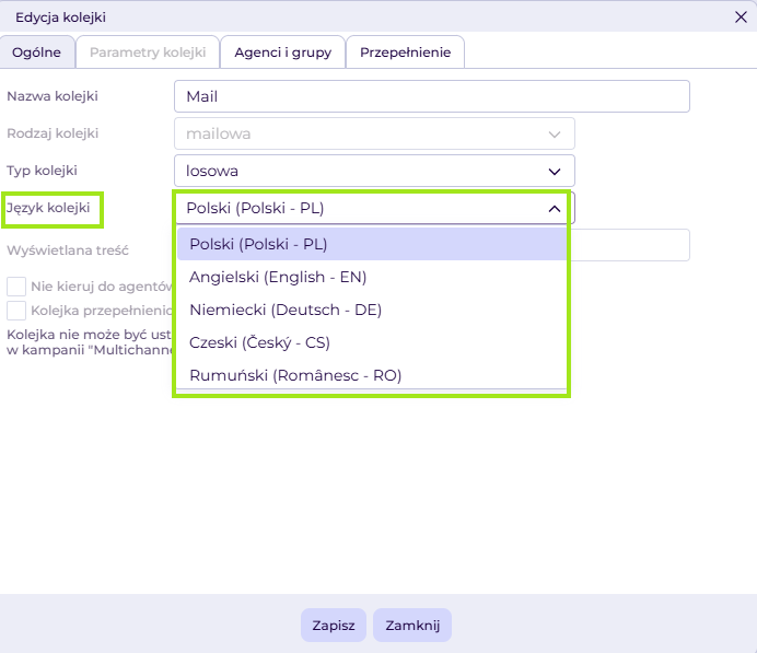 Aby ustawić język kolejki, w panelu Administratora przejdź do menu Kampanie > Kolejki > dodaj nową lub edytuj istniejącą.