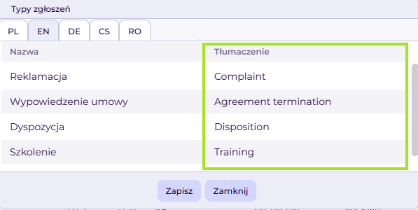 W pierwszej zakładce - polskiej zdefiniuj nowe typy zgłoszeń, edytuj lub usuń istniejące.