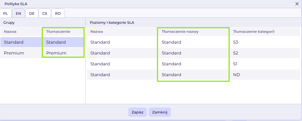 Aby zdefiniować automatyczne odpowiedzi poza godzinami pracy, przejdź do edycji polityki SLA. Zdefiniuj ustawienia polityki SLA w pierwszej zakładce, a w następnych dodaj tłumaczenia adekwatne do nazwy zakładki.