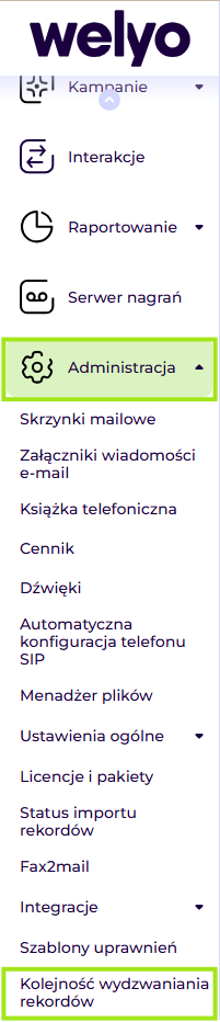 Kolejność wydzwaniania rekordów jest możliwa do skonfigurowania z poziomu Administratora. Aby móc skonfigurować szablon należy wybrać z Menu Głównego Administracja > Kolejność wydzwaniania rekordów